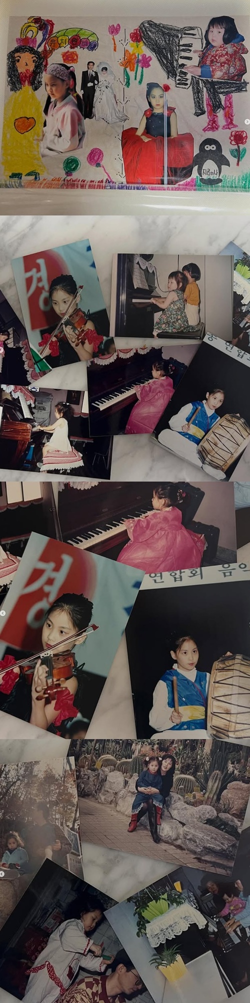 公開された写真には、ピアノを真剣な眼差しで演奏する姿、ステージ上でバイオリンを奏でる凛とした姿、韓服を着て伝統楽器のチャングや太鼓を打つ姿など、多才な幼少期のソヒョンの姿が収められている。