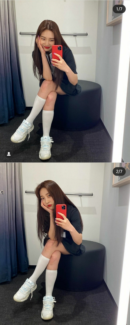 写真には、試着室のような場所でスマホを鏡に向け、自撮りしたジョイの姿が写っている。ジョイは、カメラを見ながら微笑み、さわやかさを発揮。腰まで届く長いストレートヘアとレッドリップ、赤いスマホケースが学生のような自然な魅力を引き立たせた。