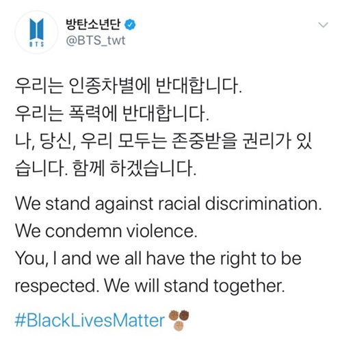 BTSの公式ツイッターには6月4日、「私たちは人種差別に反対します。私たちは暴力に反対します。私、あなた、すべての人には尊重される権利があります。共にします。We stand against racial discrimination.We condemn violence.You, I and we all have the right to be respected. We will stand together.」というツイートが公開された。