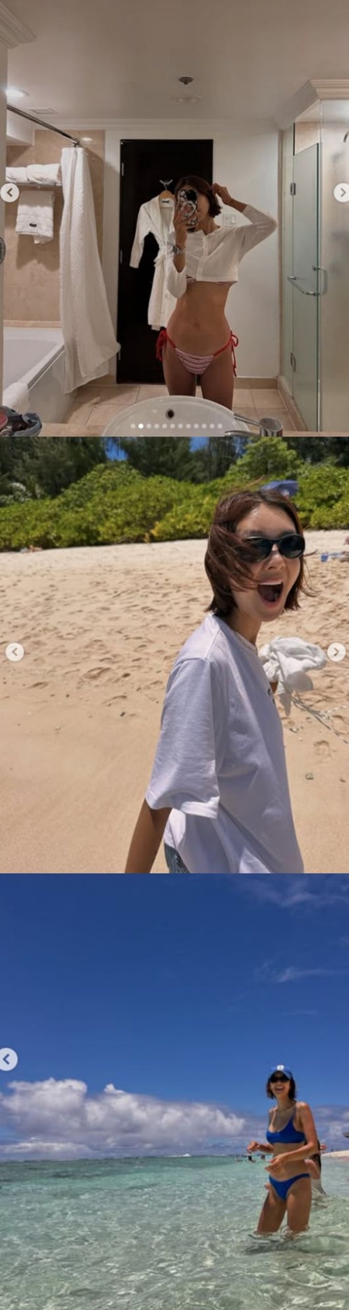 公開された写真の中で、キム・ビヌはビキニ姿で鏡越しのセルフィーを撮っている。その後は子どもたちと海辺で水遊びを楽しむ姿も見られ、夏の終わりを満喫している様子だ。