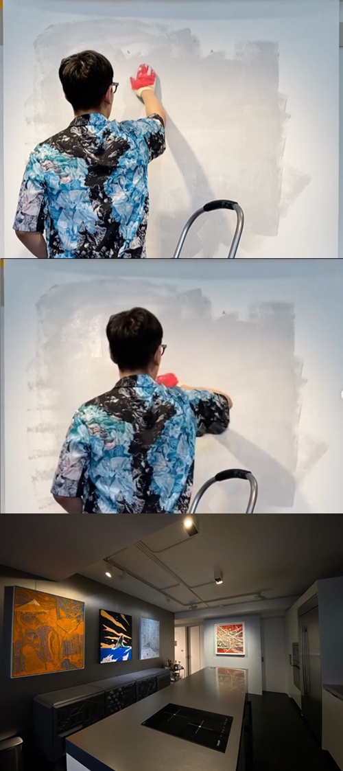 映像の中のT.O.Pは黙々と壁に色を乗せているが、後ろ姿からも楽しそうな様子が伝わってくる。キッチンと思しきエリアにはさまざまな絵画が飾られ、個人の住宅とは思えないゴージャスな雰囲気を醸し出している。