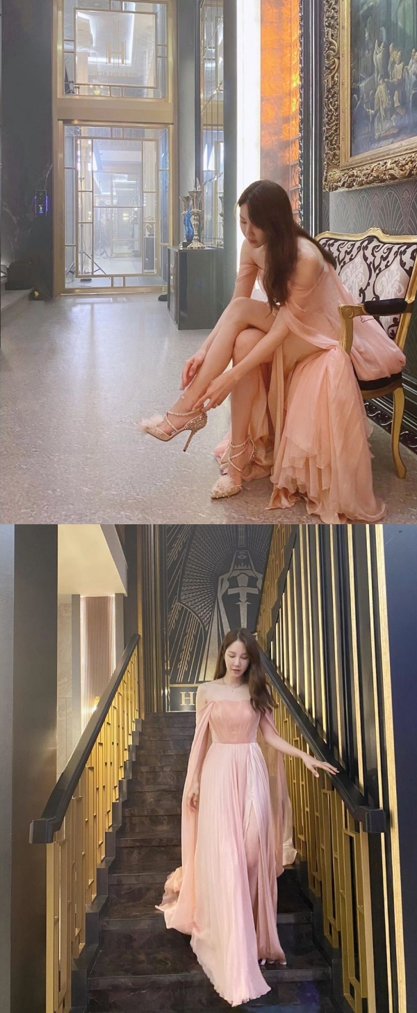 写真の中のイ・ジアは、淡いピンク色のドレスを着て優雅な雰囲気を漂わせている。