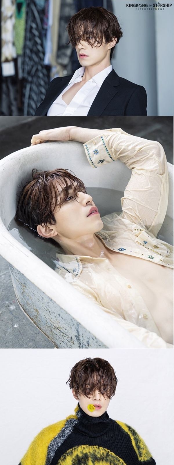 公開された写真には、シャツを着たまま浴槽の中でポーズを取るイ・ドンウクが写っている。白い肌に濡れた髪、深みのある眼差しは、彼の色気を際立たせている。