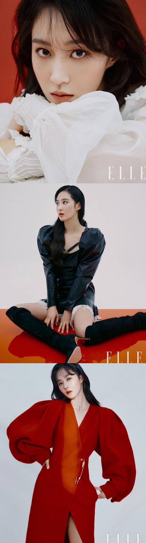 また別の写真のユリはグラマラスなパフスリーブが印象的な真紅のコートで洗練された雰囲気を纏っている。ブラックレザーのワンピースを身にまとった写真では清純な魅力を披露した。