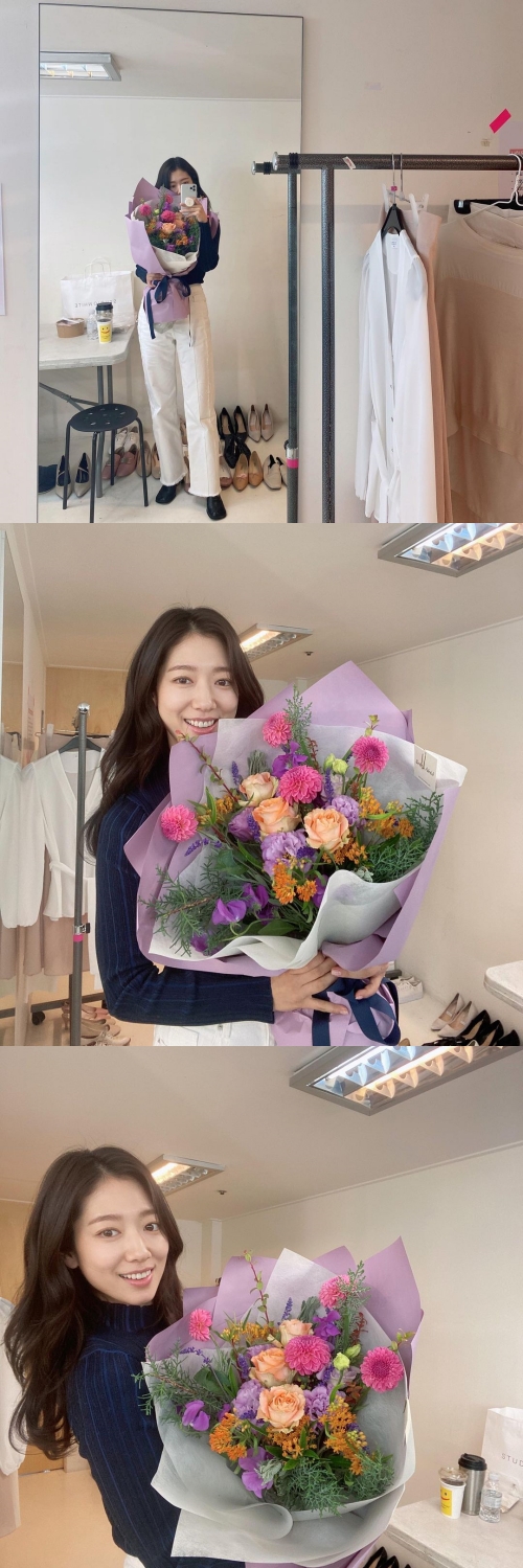 写真には、大きな花束を持ったパク・シネが笑顔でカメラを見つめる姿が写っている。