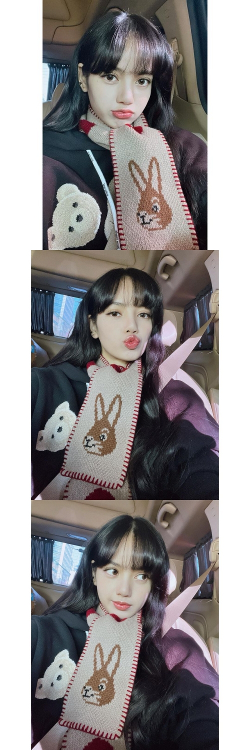 公開された写真には、車内で自撮り撮影をするリサが写っている。 ウサギモチーフのマフラーを巻いたリサは、目線を外したり、口をすぼめたりしてチャーミングな魅力を見せつけた。