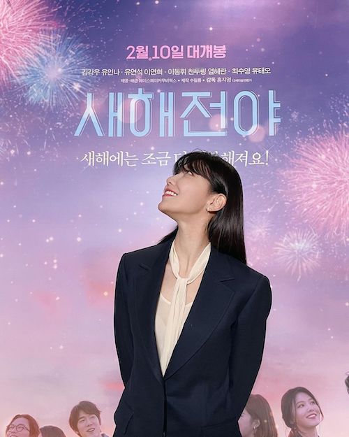 写真の中には、映画『新年前夜』大型ポスターの前で微笑むスヨンの姿が写っている。前日のメディア試写会に出席した彼女は、出演映画が自分の誕生日に公開される喜びを噛み締めているようだ。