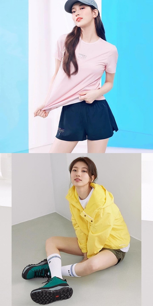 写真の中のペ・スジは、アウトドアブランドK2のアイテムを見事に着こなしている。パウダーピンクやビタミンイエローなど、春らしさ満点のカラーはペ・スジならではの清純な美貌を一層際立たせた。