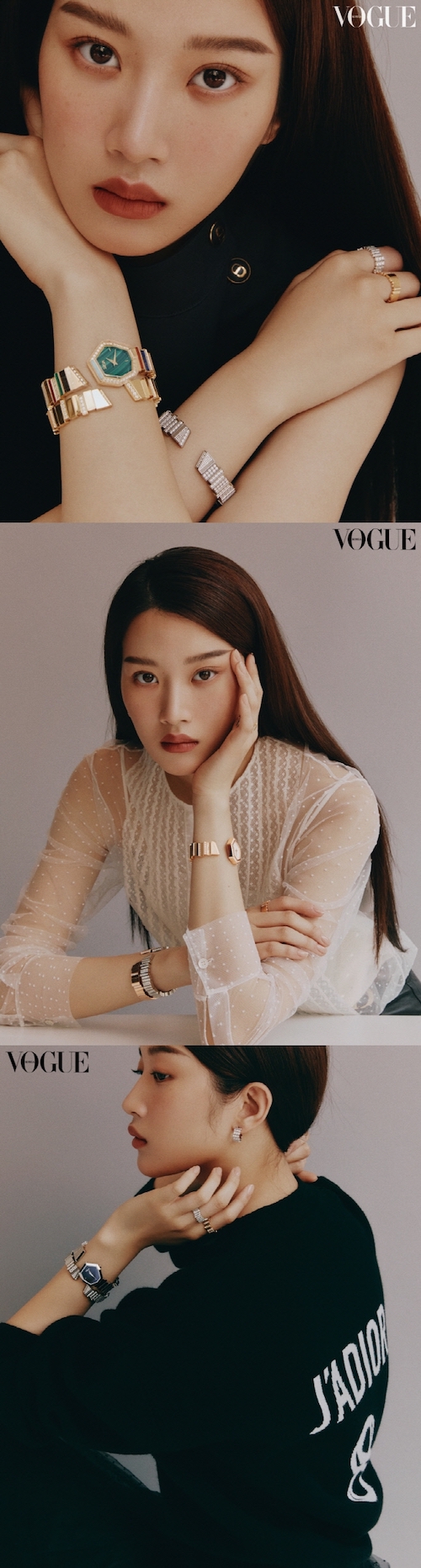 ドラマ『女神降臨』(原題)でMZ世代の美容・ファッションアイコンとしての地位を固めたムン・ガヨン。世界的ブランド「DIOR」のジュエリー&時計とコラボした今回の撮影カットでは、高級感あふれるメイクで魅惑かつ大人びた雰囲気を強調している。