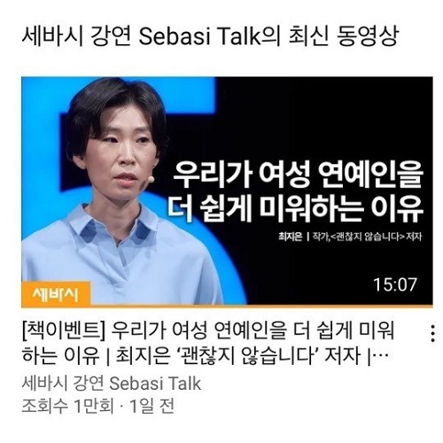 またチェ・ジウンは「韓国社会は女性の見た目、表情、しゃべり方、趣向など、すべての詳細に評価し、狭い枠からはみ出たら、それを非難する傾向がある。許容される女性の枠があまりに狭い」とし、「そのため女性芸能人の安易に評価され、大きく非難を受ける存在」と指摘した。