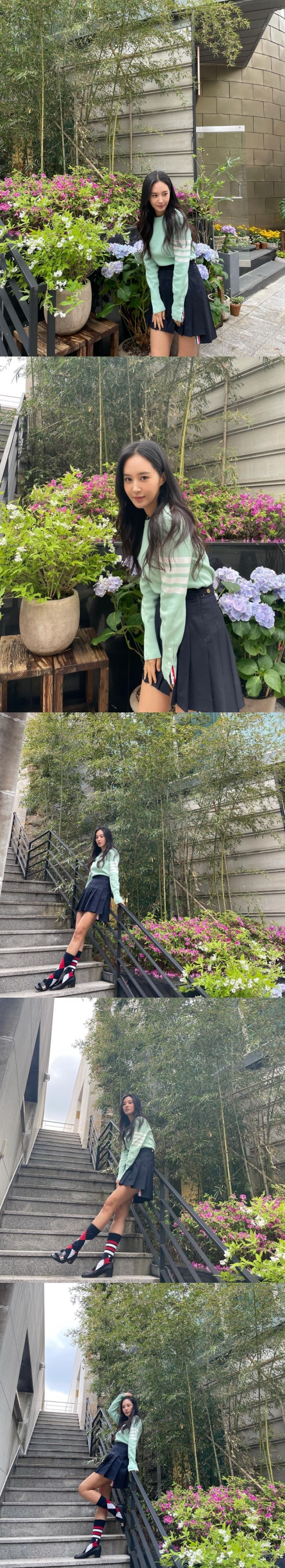 公開された写真には、ミントカラーのトップスに黒のプリーツスカートというコーディネートで爽やかな魅力に溢れたユリが写っている。ユリはナチュラルメイクで清純な雰囲気だ。