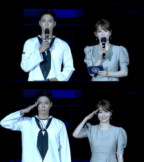 白い軍服姿でステージに登場したパク・ボゴムは、自分のことを「海軍本部文化広報兵の上兵(=上等兵)、パク・ボゴム」と紹介。一段とたくましい姿だけでなく、行事の段取りをすべて覚えたかのようなスムーズな進行で見る人を感嘆させた。