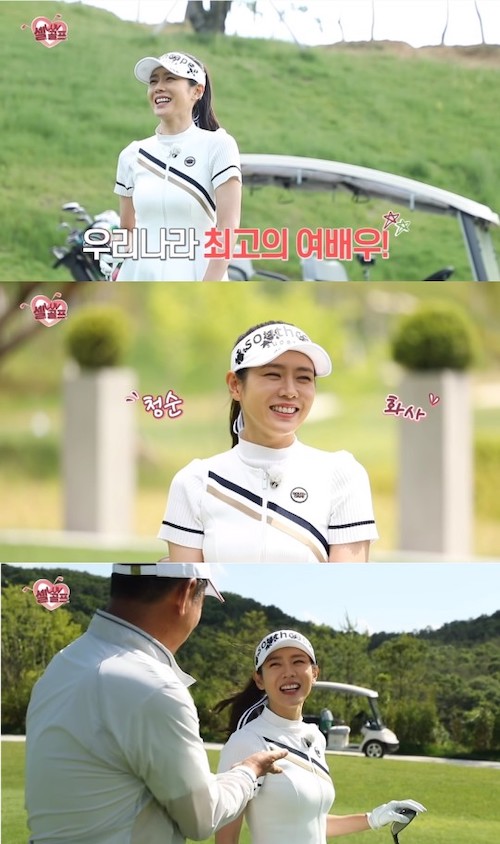 清楚な白いゴルフウェアに身を包んで登場したソン・イェジンは、完璧な姿勢でドライバースイングを披露。それを見たイム・ジンハンは「(そもそも)姿勢が悪かったら出演オファーもしなかった。個人的に僕とプレーすると本当に上手い」とほめた。