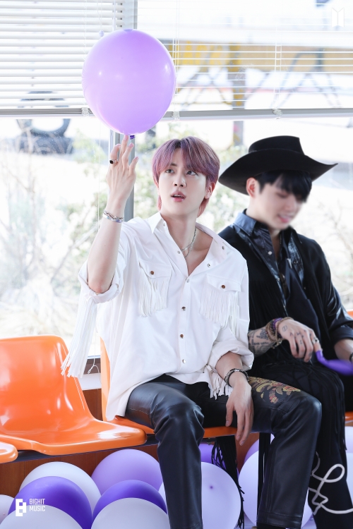 別の写真には、紫の風船を見つめるJINの姿が写っている。カメラを意識していないにもかかわらず完璧なビジュアルを誇っており、“顔天才”の一面を見せつけた。