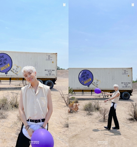 J-HOPEは、今回のミュージックビデオでもポイントとなっている紫の風船を持ちながら、爽やかな笑みを浮かべている。