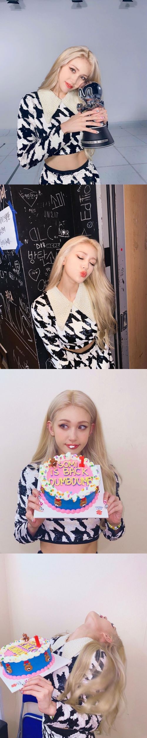 投稿された写真には、音楽番組『M COUNTDOWN』(Mnet)で獲得した1位のトロフィーを大事そうに持つソミの姿が写っている。