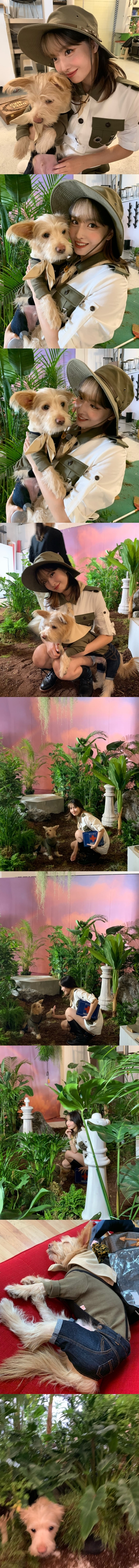 写真には、ジャングルのようなセットをバックに撮影するモモの姿が写っている。