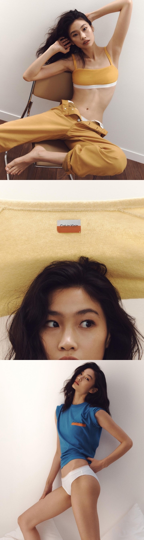 写真は、「Calvin Klein(カルバン・クライン)」の広告ビジュアル。くすんだイエローのブラトップとデニムパンツを着こなしているチョン・ホヨンは、椅子に座りながらポーズを決めている。無駄な肉一つないスリムなウエストと二の腕が目を引く。