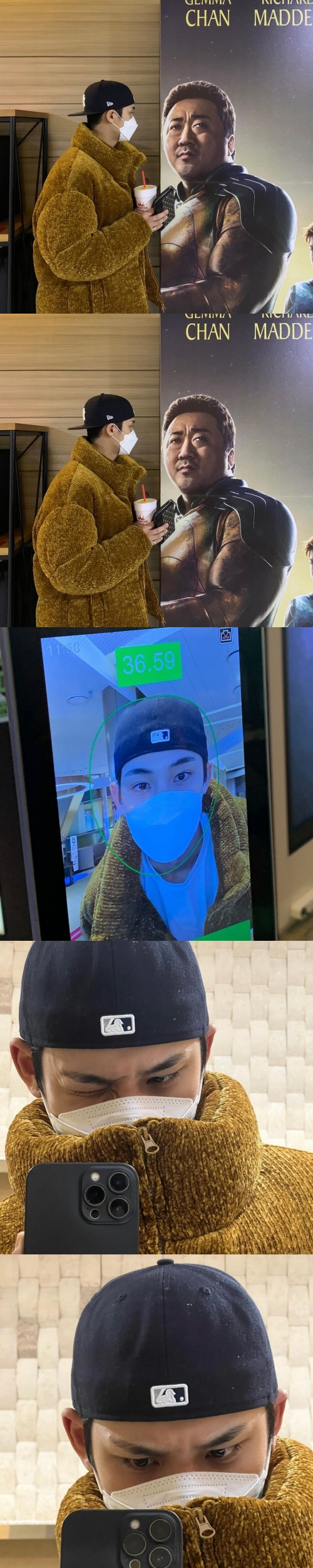 写真には、マ・ドンソクが出演する映画『エターナルズ』のポスターの前で記念写真を撮るMINGYUの姿が写っている。