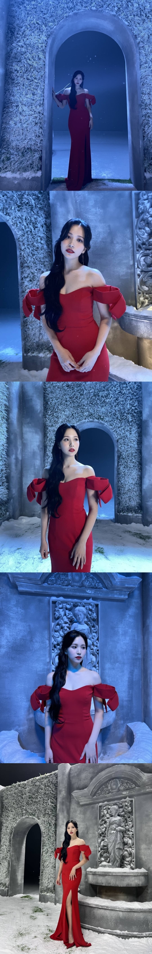 写真には、真っ赤なオフショルダードレスを身に纏ったミナの姿が写っている。軽くカールがかったロングヘアはおろしており、まるで童話の中のお姫様のようだ。