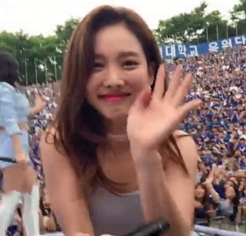 熱狂する学生たちの前でこれまでのヒット曲を披露する中、メンバーのナヨンは動画を撮っていたファンの前に近寄り、アイコンタクトやウィンクをするなど、心ときめくファンサービスを行った。