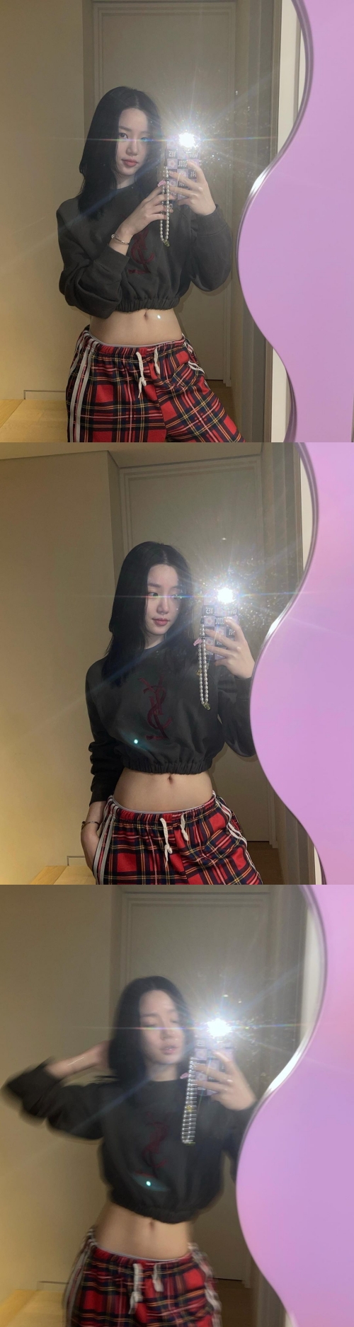 写真には、鏡の前で自撮りをするイ・ユビの姿が。髪型が茶髪のロングヘアから黒髪のミディアムヘアに変化していることがわかる。クロップドトップスからはウエストが露出しており、ぜい肉一つないスリムなボディを見せつけた。