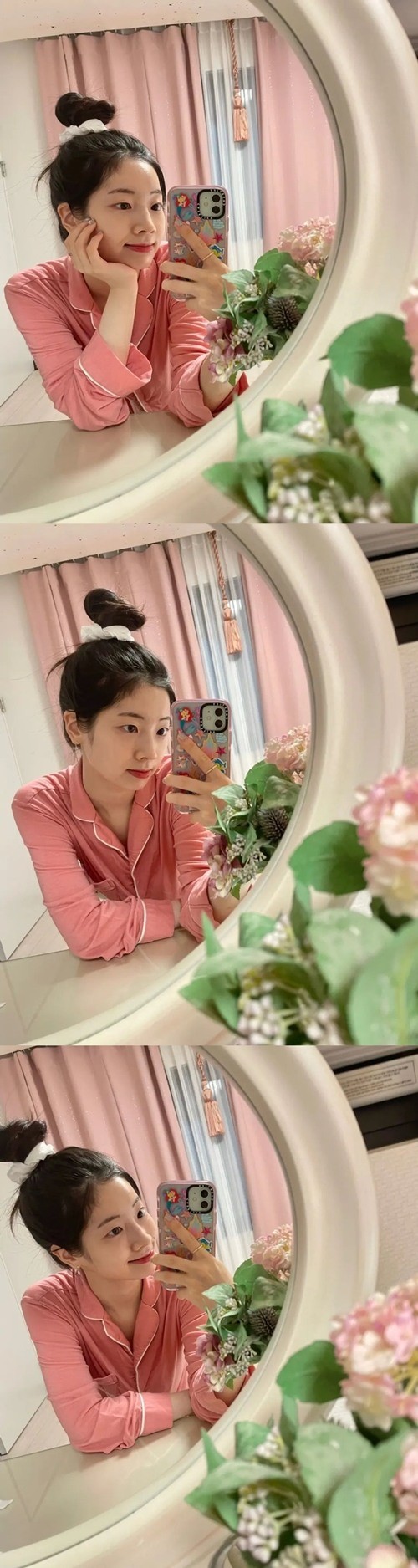 投稿された写真でダヒョンは、パジャマ姿で“鏡セルカ”をしている。リラックスした雰囲気で髪を上げて束ねており、彼女の清涼な魅力が十二分に伝わってくる。