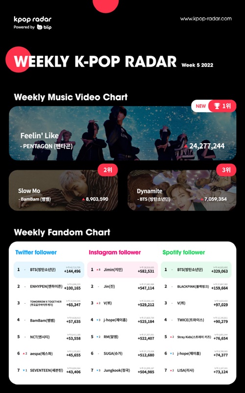 PENTAGONの『Feelin' Like』MVは、K-POPレーダー5週目の集計期間(2022年1月23~29日)で2428万回再生を記録し、1位となった。