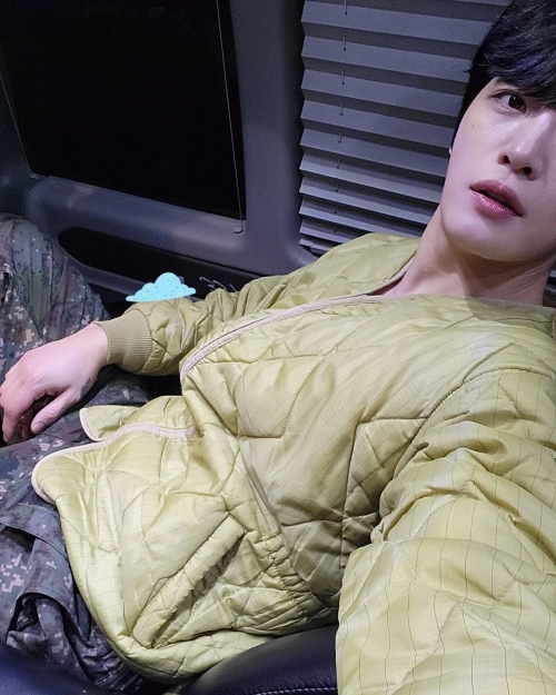 写真には、車内と思われる空間で自撮りをするジェジュンの姿が。キルティングアウターに迷彩柄のパンツを着用した、“韓国のミリタリースタイル”を披露している。