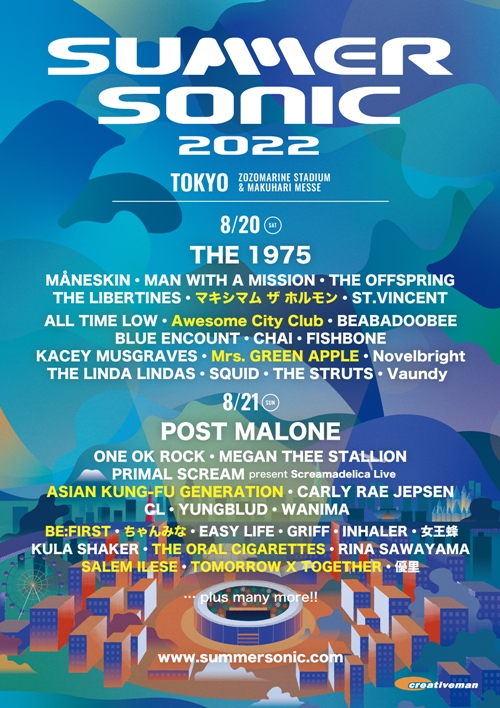 約3年ぶりの開催となる「SUMMER SONIC2022」は、すでに33組の出演が発表されており、ヘッドライナーには、デビュー以来SUMMER SONICのステージとともに成長を遂げてきたイギリスのロックバンド THE 1975、そしてジャンルを超越した世界的スーパースターのポスト・マローンが務める。