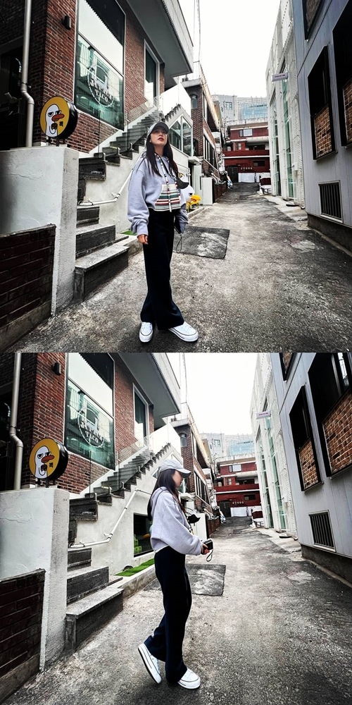 写真のキム・テヒは路地で空を見上げている。キャップにスウェットパーカー、スニーカーというワンマイルウェアスタイルで、平凡な日常を楽しんでいるようだ。