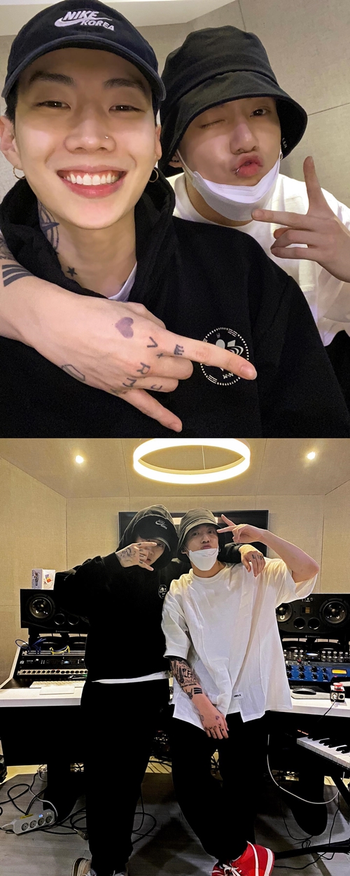 公開された2枚の写真には、作業部屋と思われる空間でパク・ジェボムとJUNG KOOKが肩を組み、仲の良さをアピールしている。