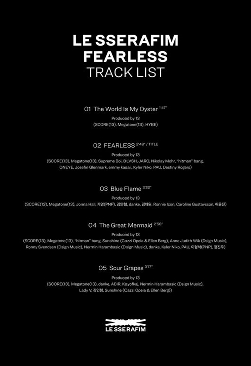 LE SSERAFIMのデビューアルバムには同名のリード曲『FEARLESS』を含め、『The WorldIs My Oyster』『Blue Flame』『The Great Mermaid』『Sour Grapes』の計5曲が収録される。