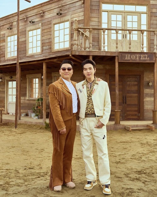 写真のPSYとSUGAは、ウエスタンムードの衣装を着用し、セット上の前で並んで立ってカメラを見つめている。PSYがSUGAの方に手を乗せており、雰囲気の良さが伝わってくる。