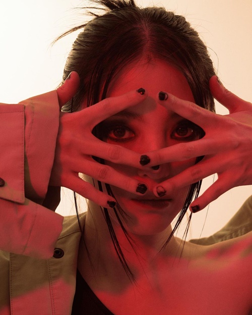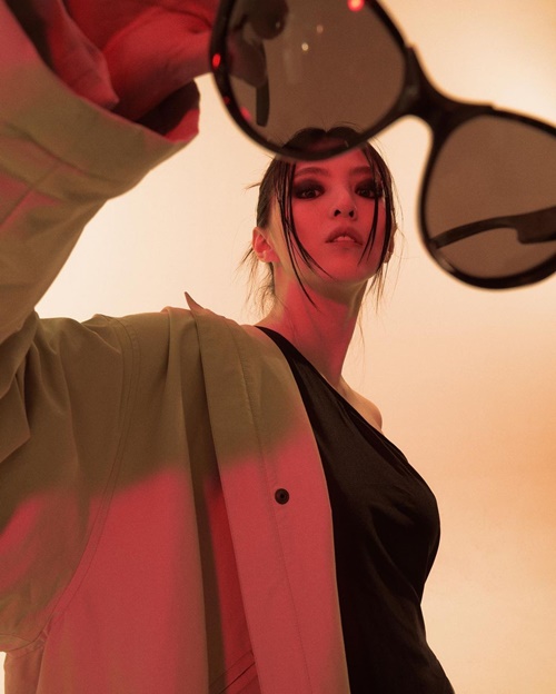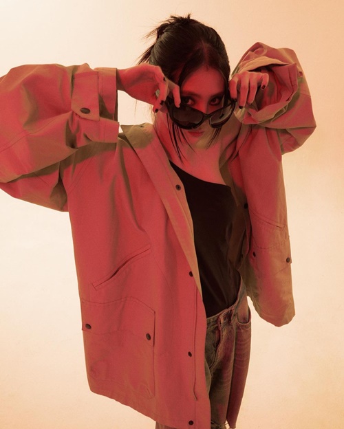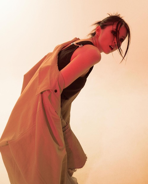 写真を見ると、黒のワンショルダータンクトップにオーバーサイズのコートを合わせたハン・ソヒが、カメラに向かって多彩なポーズを披露している。