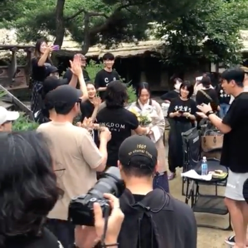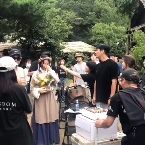 背中に「KINGDOM SEASON2」と書かれた黒いTシャツを着たスタッフら、主演俳優チュ・ジフン、キム・ソンフン監督などから拍手をもらったペ・ドゥナは、感極まって涙を流している。