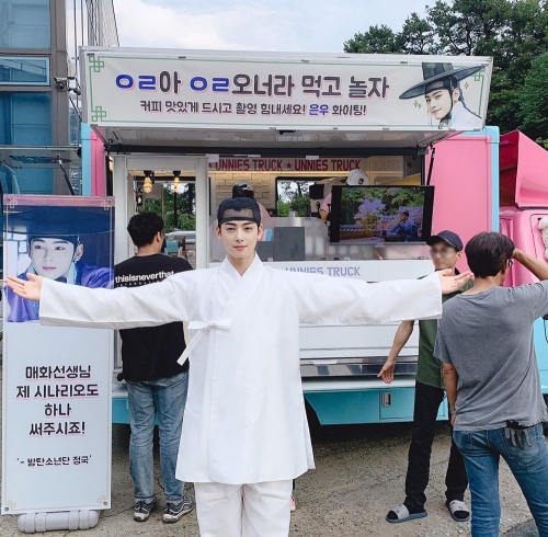 現在ドラマ『新米史官ク・ヘリョン』(原題、MBC)に出演中のチャ・ウヌは、BTSジョングクからの差し入れであるコーヒートラックの前でポーズを取っている。
