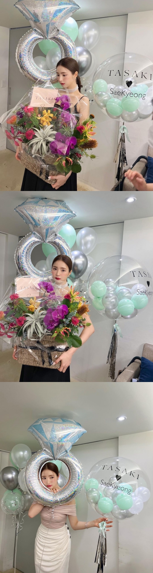 公開された写真には、広告撮影を終えて両手いっぱいの花束を抱くシン・セギョンが写っている。