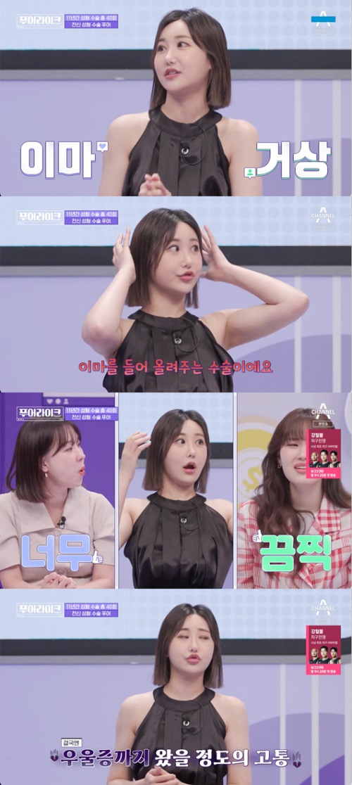 彼女は「頭皮を切開して額を持ち上げるのだ」とし、「頭皮を切開して虫が這っているようだ。かゆくてぴりぴりして、とても痛い。うつ病にまでなった。骨を削るところまでは耐えたが、リフティングには耐えられなかった」と説明した。また残高が40万ウォン(約4万円)しかないとも話した。