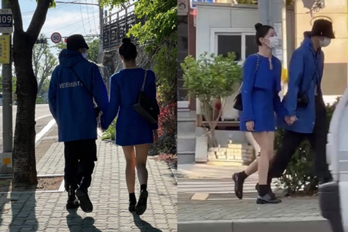 写真の2人はブルーの服でコーディネートを合わせ、マスクで顔を隠している。ネットユーザーたちは、この女性を、YGエンターテインメント所属の新人女優ムン・ジヒョと推測した。