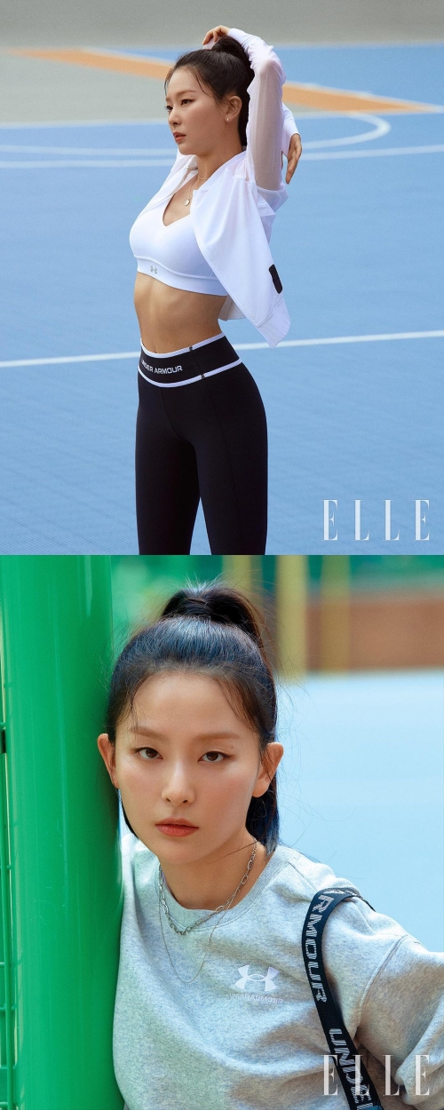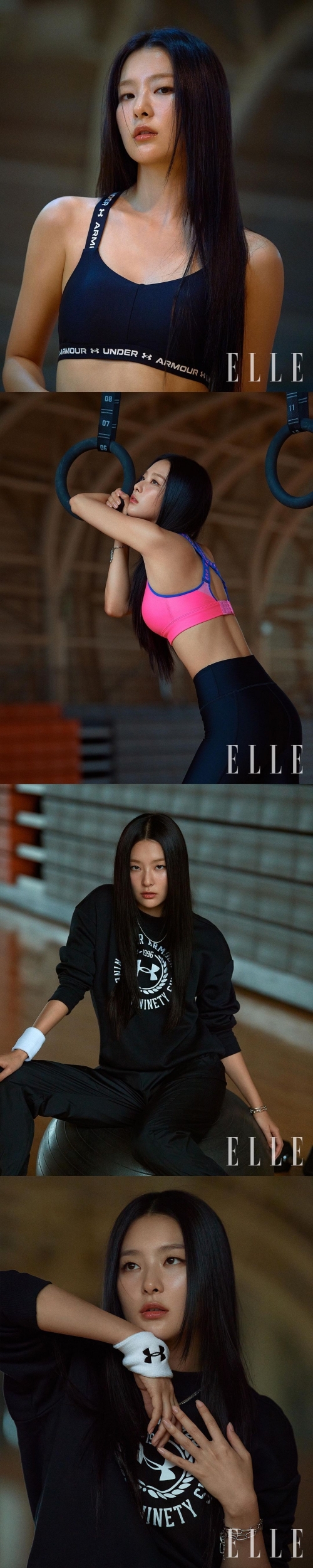 体育館を舞台にスポーティーな装いのスルギは、さまざまなポーズを決めてカリスマ性あふれるビジュアルを完成させた。