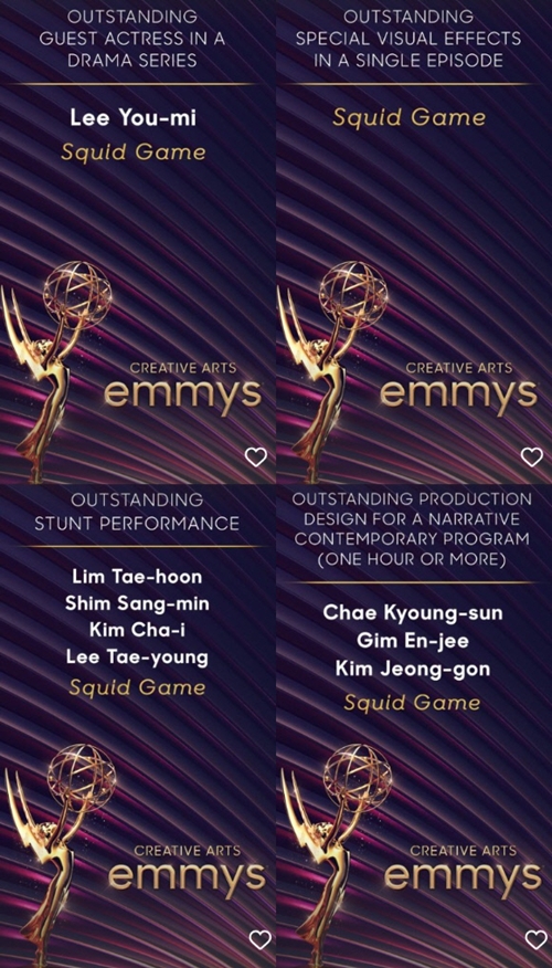 『イカゲーム』は9月4日(現地時間)、米ロサンゼルスのマイクロソフト・シアターで開かれた第74回プライムタイム・クリエイティブ・アーツ・エミー賞(Creative Arts Prime time Emmy Awards)授賞式で、ゲスト賞とスタントパフォーマンス賞、視覚効果賞、プロダクションデザイン賞受賞など計4部門のトロフィーを受賞した。