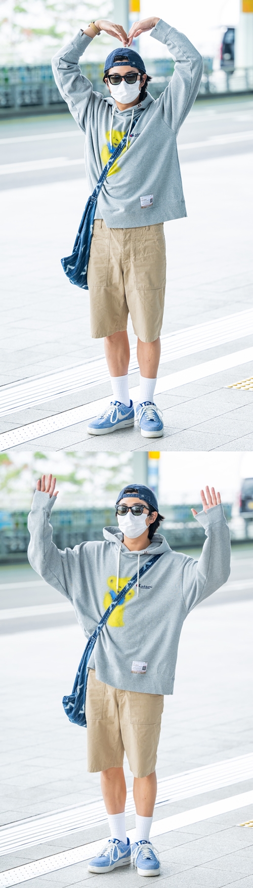 RMは今回、グレーのフーディーに膝下丈のショートパンツ、NIKEのエアフォース1というカジュアルコーデで空港に姿を現した。