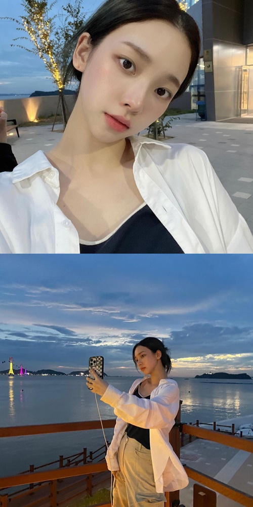 KARINAはほぼすっぴんに近いようなナチュラルメイクで、ラフな服装に身を包んでいる。目鼻立ちの整ったビジュアルが目を引くのはもちろん、束の間の休息を楽しむ姿でファンをほっこりとさせた。
