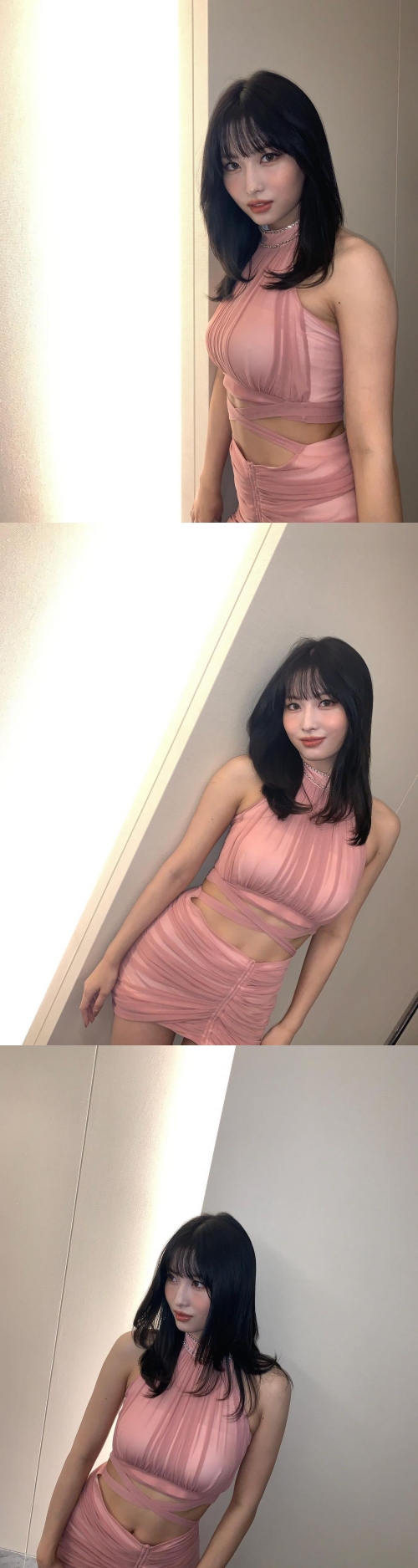 「昨日」という日本語のキャプションとともに公開された写真には、壁に寄りかかりながらこちらを見つめるモモの姿が収められている。 鎖骨のラインで切り揃えられた黒髪のミディアムヘアを誇りながら、アンニュイな表情を浮かべている。
