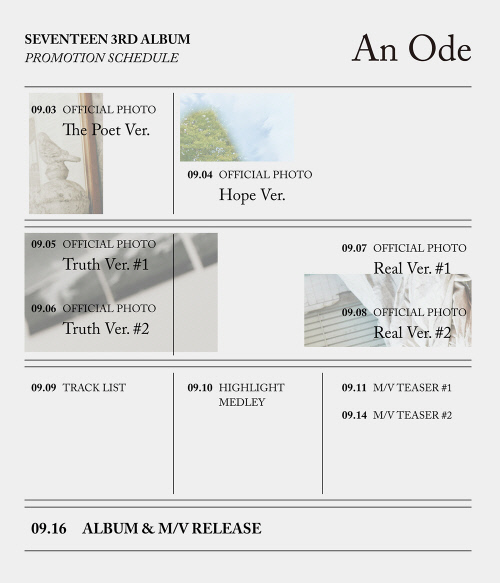 今回解禁されたプロモーション・スケジュールによると、オフィシャルフォトは『The Poet Ver.』『Hope Ver.』『Truth Ver.』『Real Ver.』の、計4種類。そのほかにも、スケジュール上には「トラックリスト公開」「ハイライト・メドレー」「MVティーザー」といったプロモーション活動が詳細の日付と共に記載されている。SEVENTEENの粋なプロモーション予告は、カムバックに対する期待感をさらに高めた。