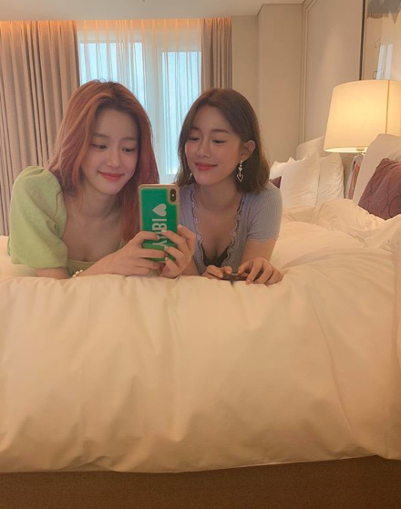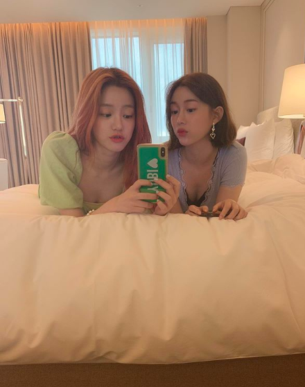 写真に写ったのは、ピンク色のヘアをした姉のイ・ユビと、ショートヘアの妹イ・ダインがベッドの上でうつ伏せになったまま微笑んでいる様子。甲乙つけがたい2人の美貌が際立つ。