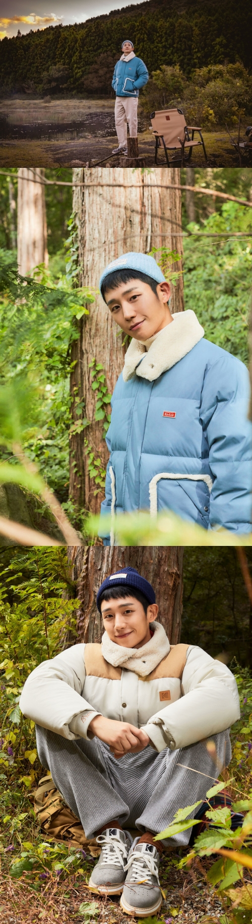木に寄りかかりながらポーズを決めたり、座りながら愛らしい笑顔を見せたりするチョン・ヘイン。