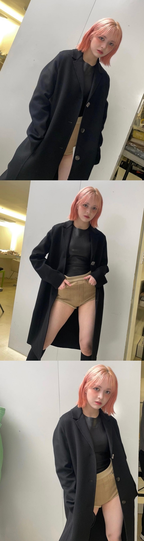 ピンクヘアにイメチェンした髪色と、黒のコートがよく合っている。