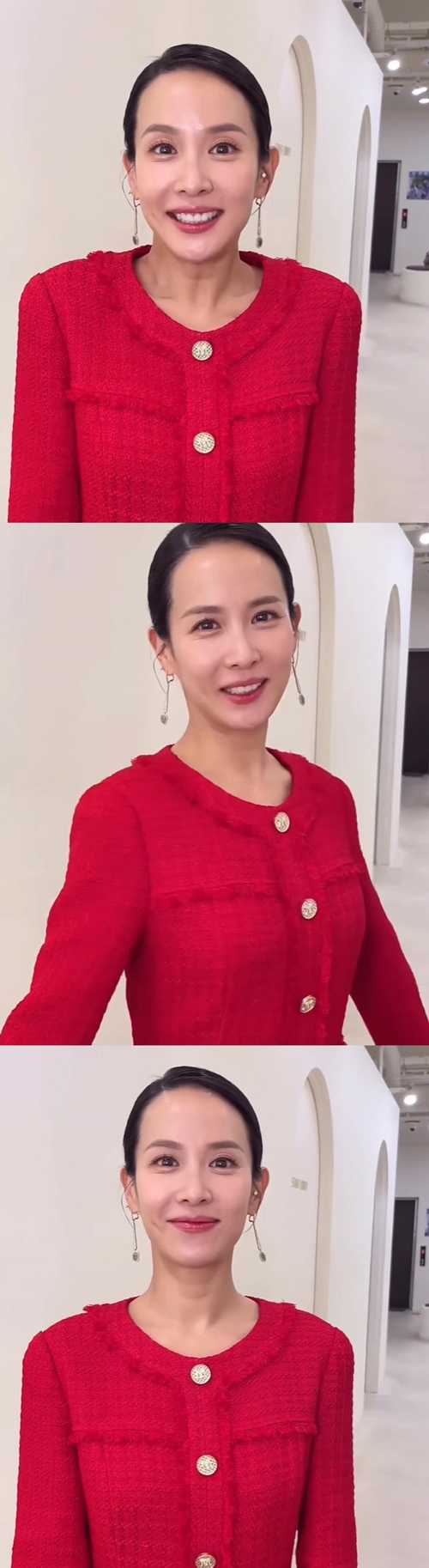 映像のチョ・ヨジョンは、タイトにまとめたヘアスタイルに真っ赤なツイードジャケットを合わせ、存在感のある大ぶりなイヤリングでポイントを与えている。